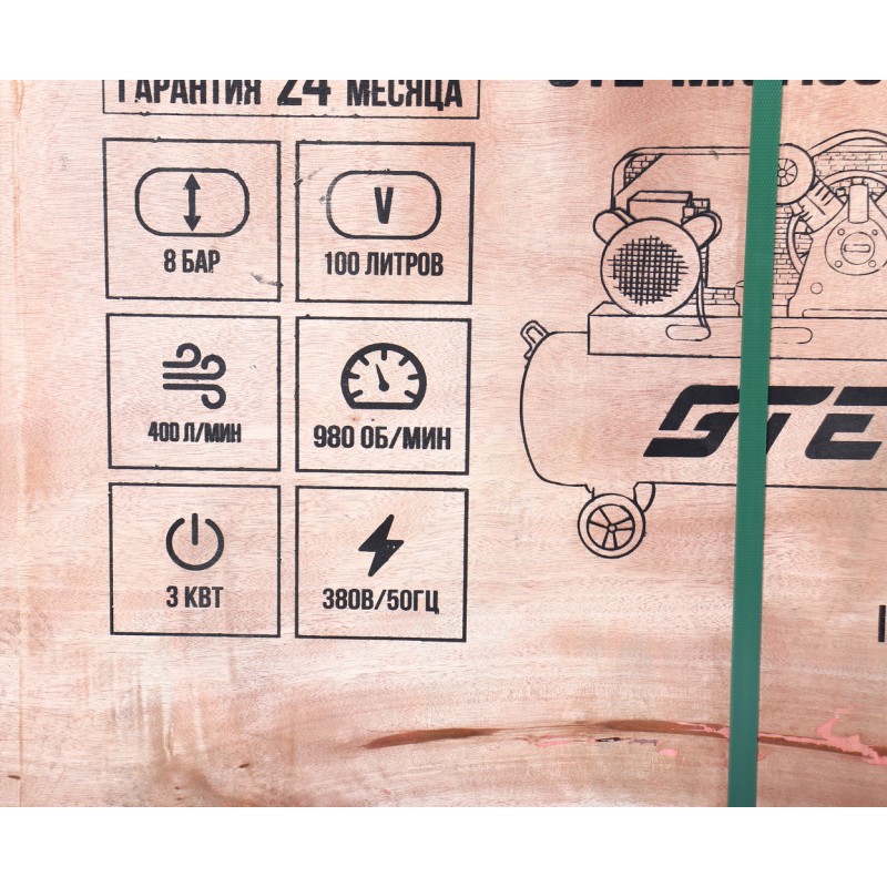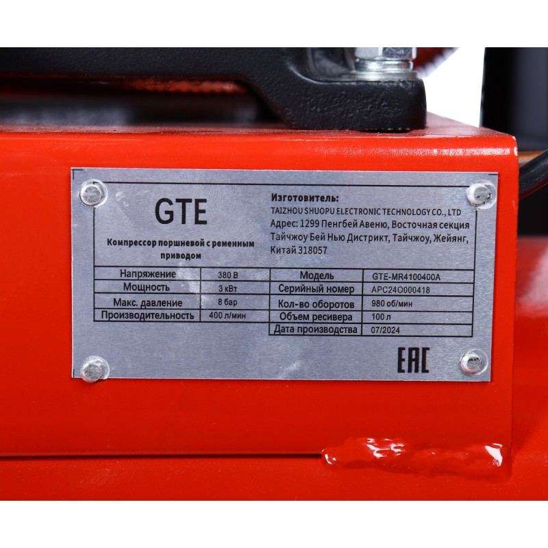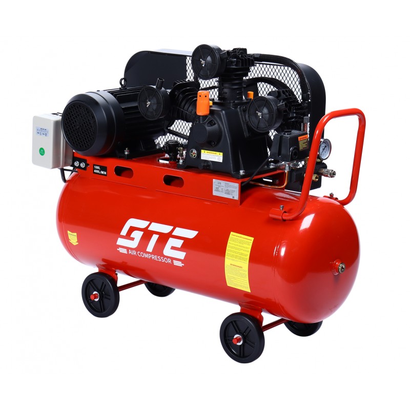 Компрессор пневматический 380В 3.0кВт 8атм. 400л/мин. ресивер-100л поршневой ременной GTE GTE-MR4100400A