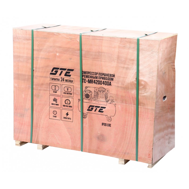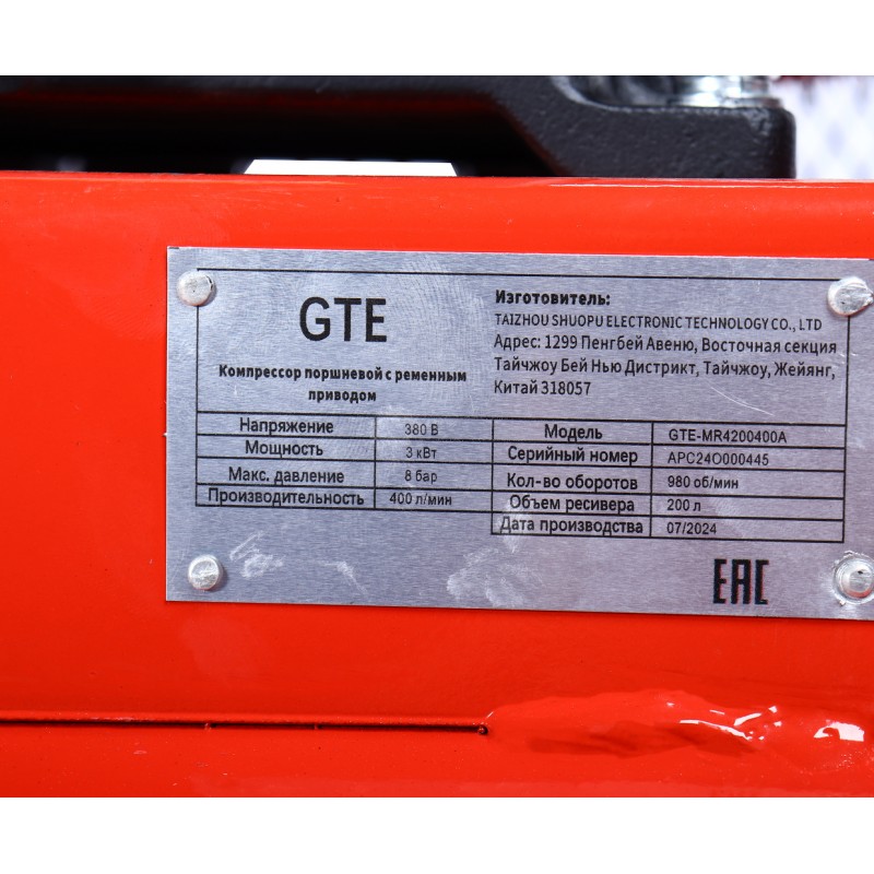 Компрессор пневматический 380В 3.0кВт 8атм. 400л/мин. ресивер-200л поршневой ременной GTE GTE-MR4200400A