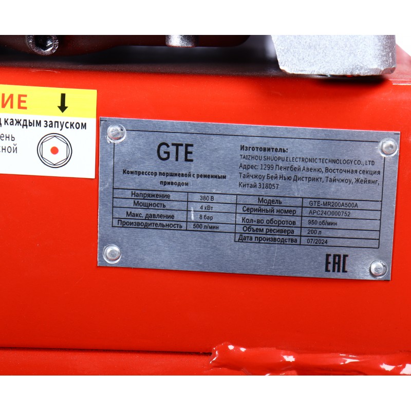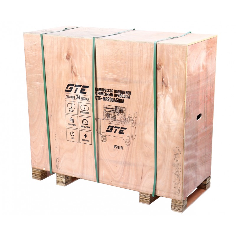 Компрессор пневматический 380В 4.0кВт 8атм. 500л/мин. ресивер-200л поршн. ремен. одноступенчатый GTE GTE-MR200A500A