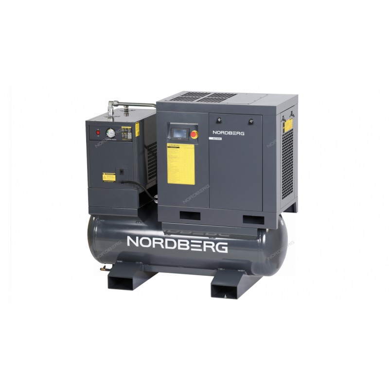 NORDBERG NCF10RD — винтовой компрессор с ресивером и осушителем.ФУНКЦИОНАЛОдноступенчатый винтовой компрессор с масляным впрыском и прямым приводом. Предназначен для стабильной подачи сжатого воздуха при работе с пневмоинструментом в условиях непрерывной эксплуатации.ПРЕИМУЩЕСТВАПрямой привод с муфтой и высоким КПД — эффективность до 90%, что в 1,5 раза выше, чем у поршневых компрессоров. Обеспечивает снижение шума, вибрации и пусковых нагрузок;Частотный преобразователь — плавный запуск, регулировка оборотов, высокая энергоэффективность и снижение износа узлов;Плавный запуск компрессора – защита электросети и снижение износа компонентов двигателя;Низкий уровень шума 63 дБ для комфортной работы даже в закрытых помещениях;ЖК-дисплей с русифицированным интерфейсом значительно упрощает все этапы настройки и работы.NORDBERG NCF10RD — надёжный и мощный компрессор для длительной работы под высокой нагрузкой. Повышает производительность и снижает трудозатраты при использовании пневмоинструмента. Идеально подходит для СТО, автосервисов и промышленных предприятий.