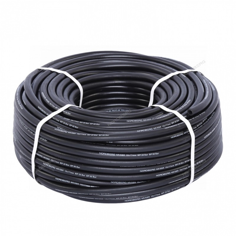 Прямой воздушный шланг NORDBERG H1017R — резиновый, с нитяным усилением 10×17 мм.ФУНКЦИОНАЛПредназначен для подачи сжатого воздуха под давлением от компрессора к пневмоинструменту. Изготовлен из гладкой резины SBR/NR.ПРЕИМУЩЕСТВАSBR (стирол-бутадиеновый каучук) — устойчив к нагреву, трению и деформации;NR (натуральный каучук) — обладает высокой эластичностью, прочностью, гибкостью и стойкостью к истиранию;Выдерживает давление до 60 бар и температуру от –30 °C до +70 °C.NORDBERG H1017R — Надёжное решение для интенсивной работы в автосервисах и производственных условиях.