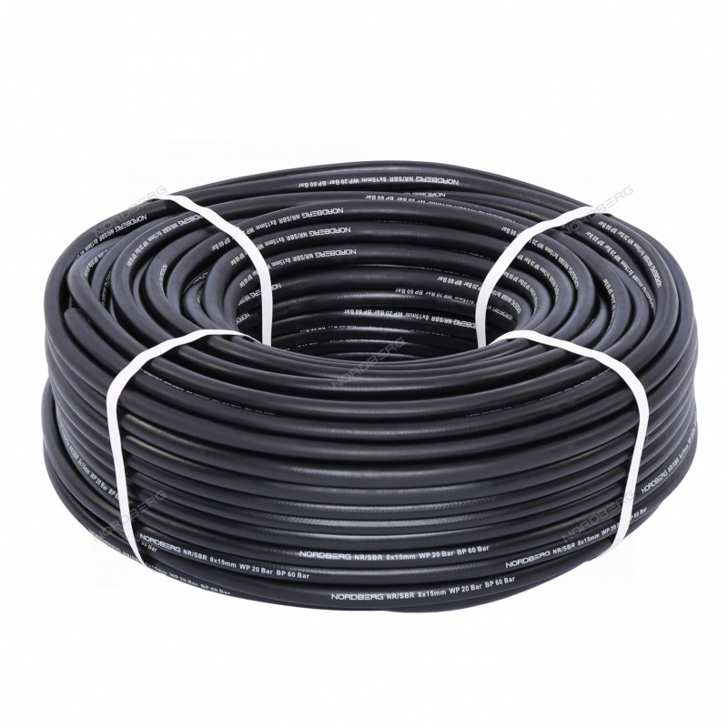Прямой воздушный шланг NORDBERG H0815R — резиновый, с нитяным усилением 8×15 мм.ФУНКЦИОНАЛПредназначен для подачи сжатого воздуха под давлением от компрессора к пневмоинструменту. Изготовлен из гладкой резины SBR/NR.ПРЕИМУЩЕСТВАSBR (стирол-бутадиеновый каучук) — устойчив к нагреву, трению и деформации;NR (натуральный каучук) — обладает высокой эластичностью, прочностью, гибкостью и стойкостью к истиранию;Выдерживает давление до 60 бар и температуру от –30 °C до +70 °C.NORDBERG H0815R — Надёжное решение для интенсивной работы в автосервисах и производственных условиях.