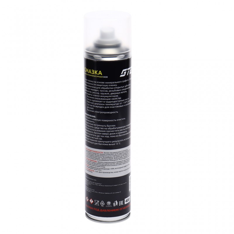 Сухая смазка на основе минерального графита. Создает на поверхности защитную пленку. Предназначена для обработки открытых зубчатых и цепных передач, тросов, резьбовых соединений, домкратов, рессор, оружия, дверных петель, для защиты клемм аккумуляторов.