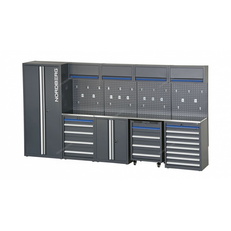 NORDBERG TT116 — универсальный модульный набор мебели для профессиональных автомастерских.ФУНКЦИОНАЛКомплексное решение для автосервисов и производственных участков, включающее шкафы, тумбы и панели, обеспечивает эффективную организацию рабочих мест, упорядоченное хранение инструментов и оборудования, быстрый доступ к ним и зонирование пространства под различные задачи.ПРЕИМУЩЕСТВАКомплексное оснащение: в набор входит 7 элементов мебели, включая выкатную тележку и перфорированные панели для подвесного хранения;Прочность и надежность: максимальная нагрузка на полку — до 40 кг, что позволяет безопасно хранить тяжёлые инструменты и оборудование;Разнообразие модулей: включая шкафы с 8 и 5 ящиками, тележку и перфорированные панели, система адаптируется под разные типы задач;Повышение производительности: структурированное хранение экономит до 30% времени на поиск инструмента и материалов;Устойчивость: шкафы и тумбы снабжены регулируемыми ножками, что позволяет установить их на неровной поверхности.УДОБСТВО ИСПОЛЬЗОВАНИЯПростота сборки: пошаговая инструкция и стандартные крепёжные элементы;Легкий уход: устойчивость к влаге, загрязнениям и механическим повреждениям при соблюдении условий эксплуатации;Совместимость с крючками, держателями и аксессуарами для перфорированных панелей;Мобильность: выкатная тумба на роликах обеспечивает удобство перемещения по рабочей зоне.КОМПЛЕКТАЦИЯДвухдверный шкаф — 1 шт.;Однодверный навесной шкаф — 4 шт.;Перфорированная панель — 4 шт.;Напольный шкаф с 8 ящиками — 1 шт.;Выкатная тумба с 4 ящиками — 1 шт.;Двухдверный напольный шкаф — 1 шт.;Cтолешница покрыта металлом — 1 шт.;Напольный шкаф с 5 ящиками — 1 шт.;Крючок длинный TH5 — 20 шт.;Крючок двойной TH6 — 10 шт.;Крепежный комплект и инструкция по сборке — в комплекте.NORDBERG TT116 — это удобное, прочное и функциональное решение для профессионалов, стремящихся к порядку, скорости и безопасности в работе.