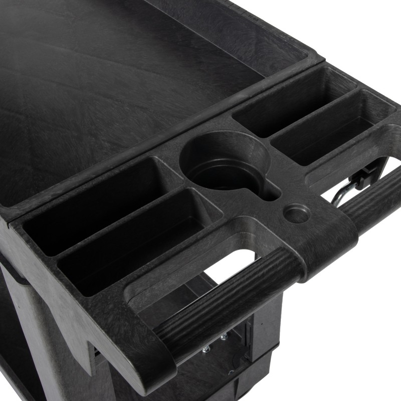Тележка двухполочная открытая удлиненная OPTIMUS HD OPT-608S изготовлена из запатентованного композитного материала особой прочности с использованием углеволокна. Прорезиненные колеса увеличенного диаметра (125 мм) обеспечивают легкое и тихое перемещение тележки по рабочей зоне.