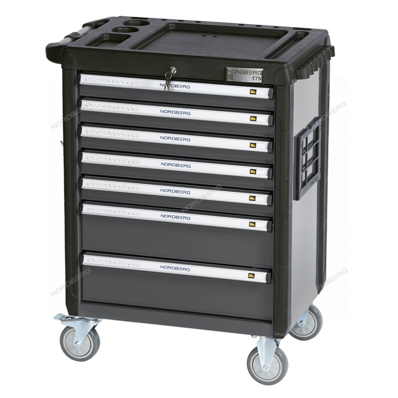 Тележка инструментальная 7 ящиков NORDBERG T7N Противоударная порошковая покраска Каждый ящик выдерживает нагрузку до 50 кг Крючки для инструмента на боковой стенкеЦентральный замокЗащитные крючки для фиксации ящиков в открытом положении