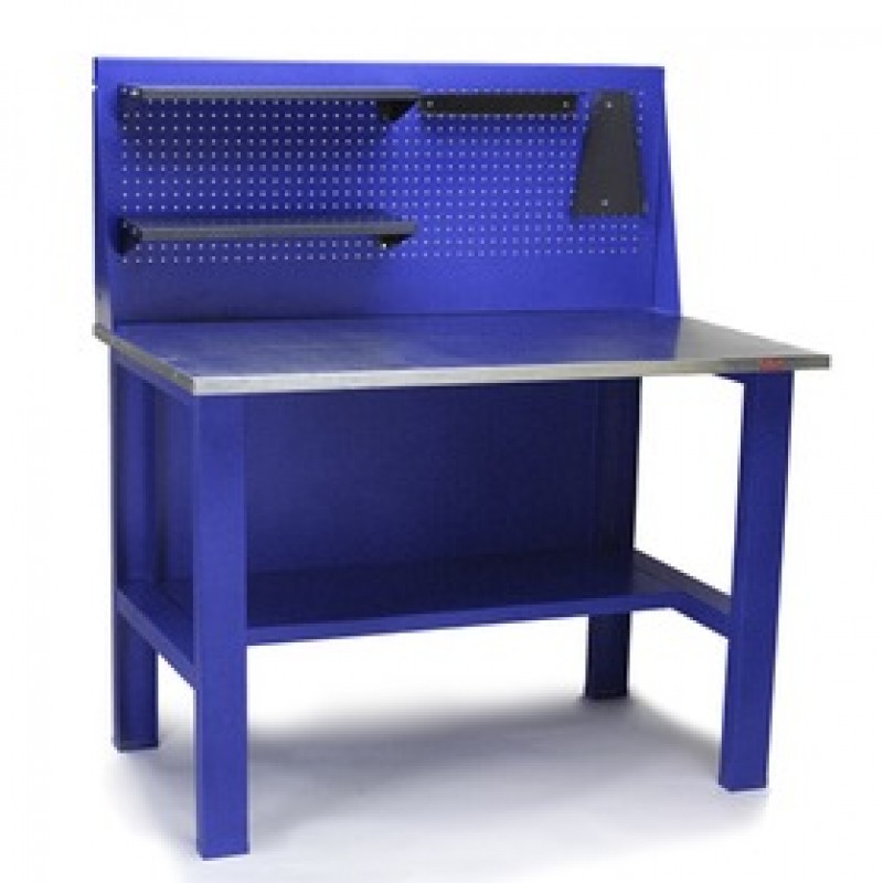 Размеры (ВхШхГ): 870x1200x500 ммВес: 54 кгНаличие тумб: бестумбовыйНаличие полок: с одной полкойНаличие экрана: с экраномЗона применения: мастерская, гараж, учебные заведенияВид столешницы: фанера и оцинкованный металл (1 мм)Допустимая нагрузка на столешницу: 200 кгСлесарный стол PROFFI-E используется для организации рабочих мест в небольших автосервисах, мастерских, цехах, гаражах и т.д. При работе за столом, стоит учитывать, что максимальная нагрузка, которую сможет выдержать изделие, составляет 200 кг. Конструкция отличается устойчивостью, стоит на двух опорах – они изготовлены из прочного листового металла. Для удобства работы имеется экран, на который устанавливаются навески, а также полка внизу. Наличие тумб не предусмотрено. Размеры и материал столешницыРабочий стол имеет небольшие габариты: ширина равна 1200 мм, его высота составляет 870 мм, глубина – 500 м. Для изготовления столешницы используется качественная фанера оптимальной толщины, которая составляет 21 мм. В качестве обшивки применяется оцинкованный металл (его толщина – 1 мм). Металл, из которого изготавливается рабочий стол, покрывается оцинкованной краской.