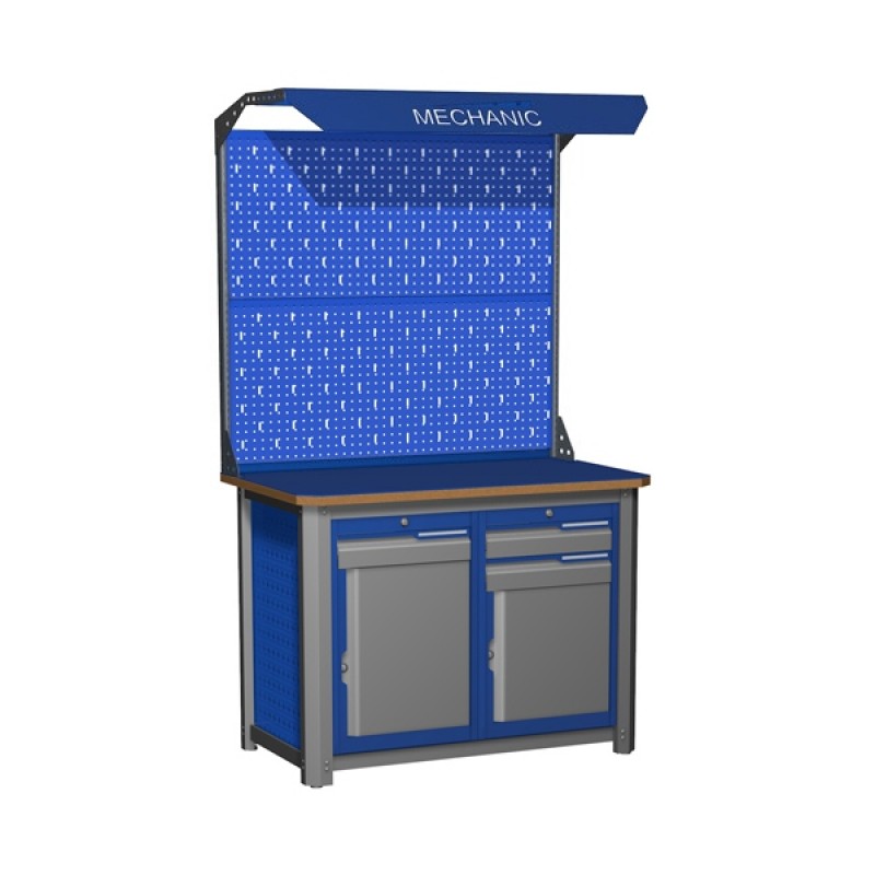 Размеры (ВхШхГ) 1200x700x870 ммНаличие тумб двухтумбовыйНаличие ящиков 3 выдвижных ящикаНаличие экрана с двойным экраном и подстветкойВиды тумб тумбы с ящиками и дверьюВид столешницы сталь (6 мм) и фанера (24 мм)Верстак MECHANIC-М12.12 Э2С, предназначенный для выполнения слесарно-сборочных операций, возможно использовать на любых производственных участках, различных мастерских, автомобильных станциях технического обслуживания и профессионально обучающих учреждениях. Технические характеристикиВерстак изготавливается из высокопрочной стали и толстой фанеры, выдерживающих максимальные нагрузки до 3000 кг. Выпускается с экраном, оснащенным подсветкой. Позволяет развешивать на него множество слесарных инструментов, которые будут находиться всегда под рукой. Комплектация включает 2 тумбы, оснащенные выдвижными ящиками с удобными ячейками для мелких деталей и ящиками с дверцей. Окрашен в синий цвет износоустойчивой краской.