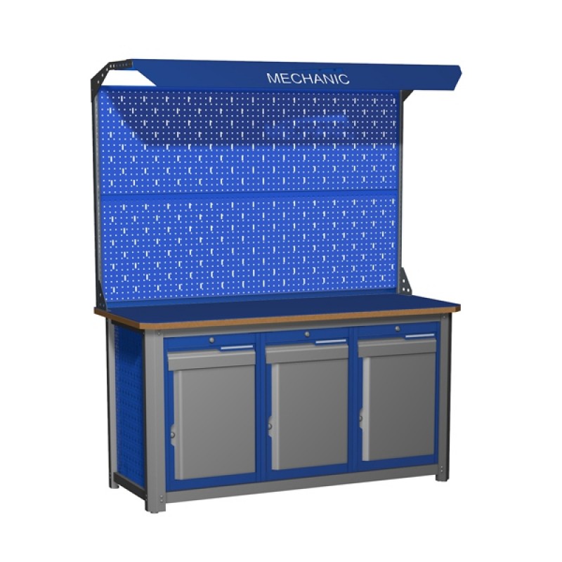 Размеры (ВхШхГ) 1500x870x700 ммНаличие тумб трехтумбовыйНаличие ящиков 1 выдвижной ящикНаличие экрана с двойным экраном и подстветкойВиды тумб тумбы с ящиками и дверьюВид столешницы сталь (6 мм) и фанера (24 мм)Верстак MECHANIC-М15.111 представляет собой конструкцию, включающую три модуля. Каждый из них оснащён выдвижным ящиком и дверцей. Также в конструкцию верстака входит перфорированный экран с встроенным освещением. Столешница изделия произведена из фанеры и защищена шестимиллиметровым слоем стали. Она может выдержать распределенную нагрузку до 3000 кг. Верстак покрыт специальной краской, которая не только улучшает его внешний вид, но и усиливает сопротивление коррозии.
