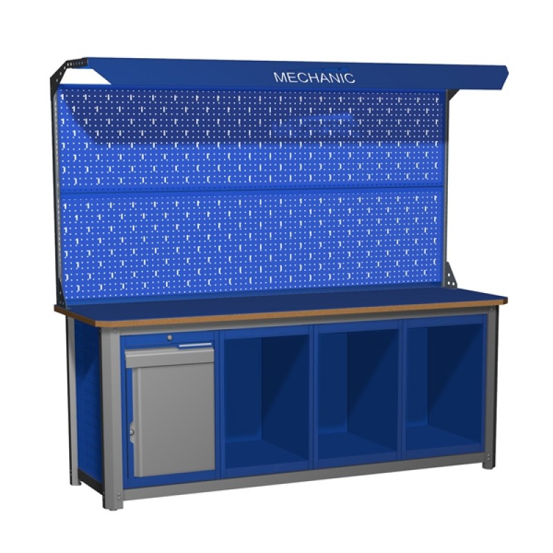 Размеры (ВхШхГ): 2000x870x700 ммНаличие ящиков: 1 выдвижной ящикНаличие экрана: с двойным экраном и подстветкойНаличие тумб: четырехтумбовыйВиды тумб: тумбы с ящиками и дверьюВид столешницы: сталь (6 мм) и фанера (24 мм)Верстак MECHANIC служит для проведения различных слесарных работ в мастерских, учебных и производственных цехах. Надежная фанерная столешница верстака и стальная рама с четырьмя опорами, позволяют выдерживать груз до 3000 килограмм. В конструкции предусмотрены четыре тумбы для инструментов, которые представляют собой одну полку с дверцей и три открытые полки. В комплектацию входит экран и подсветка. Экран имеет крепления, предназначенные для установки дополнительных инструментов.