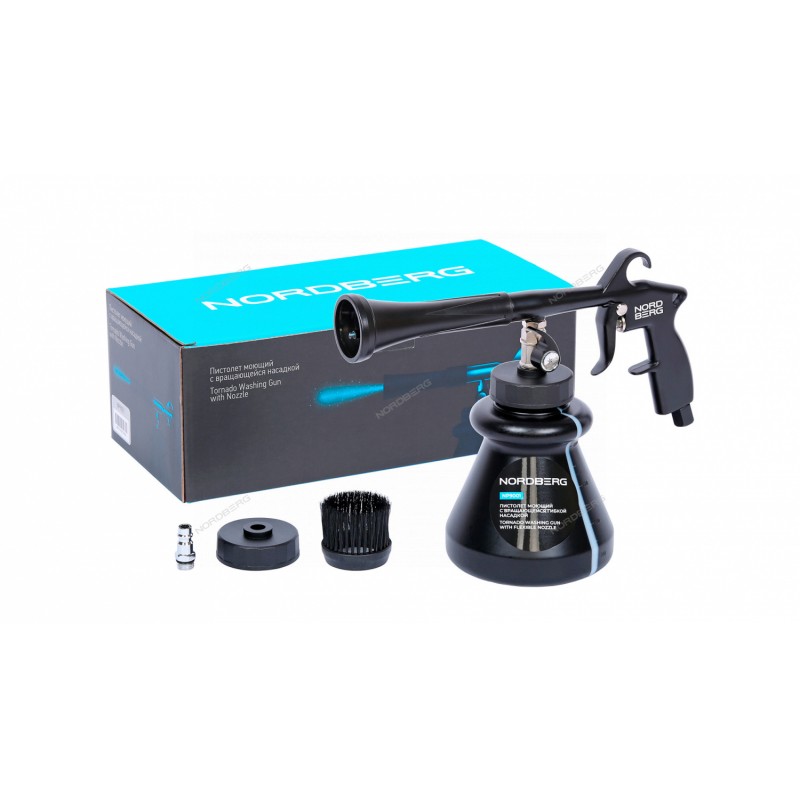 Пистолет моющий с гибкой вращающейся насадкой NORDBERG NP9001 new предназначен для быстрой, удобной мойки деталей разной формы и размера. Используется в работе с легковым, средним коммерческим и грузовым транспортом. Может применяться в автосервисе в качестве профессионального гаражного инструмента.ФУНКЦИОНАЛБлагодаря удлиненному соплу позволяет очищать труднодоступные места. Подходит для очистки двигателя. Используется при химчистке велюровых, тканевых, кожаных обивок, ковровых покрытий салонов автомобилей.ПРЕИМУЩЕСТВАУдобная мерная шкалаВыполнен из качественного прочного пластикаЭргономичная рукоять и курокРабочее давление 6,3 бар2 режима работы: с подачей воздуха / с подачей воздуха и моющего средстваУДОБСТВО ИСПОЛЬЗОВАНИЯБлагодаря легкому весу 500 г возможно долгое время работы без остановкиУстойчивость к перегрузкам и перегревамКОМПЛЕКТАЦИЯЩетка — 1 шт.Защитное кольцо для сопла — 1 шт.Сопло — 1 шт.Переходник — 1 шт.Крышка для бачка — 1 шт.Многофункциональный торнадор NORDBERG NP9001 new – высококачественное оборудование для решения различных задач детейлинга, позволяющее эффективно, легко и быстро удалять загрязнения.