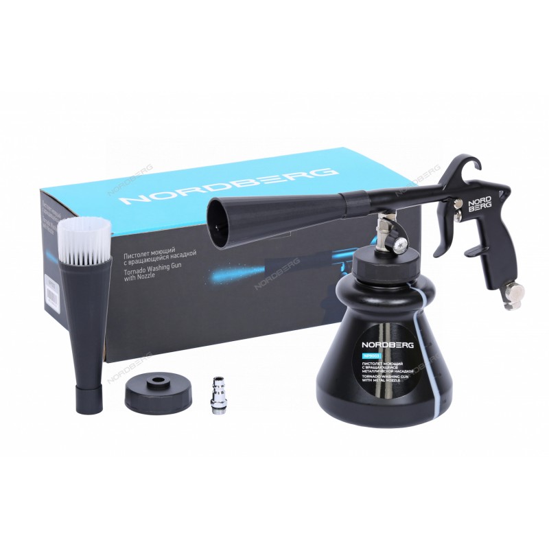 Пистолет моющий с пластиковым вращающимся распылителем NORDBERG NP9003 – профессиональное оборудование для чистки салонов легковых автомобилей, среднего коммерческого и грузового транспорта.ФУНКЦИОНАЛБлагодаря пластиковой трубке-распылителю, описывающей круговые движения с помощью сжатого воздуха, и моющей жидкости эффективно вычищаются любые поверхности интерьера автомобиля: кожа, текстиль, пластик, резина и пр.ПРЕИМУЩЕСТВАВысокая скорость вращения распылителя позволяет равномерно наносить моющие средства по обрабатываемой поверхностиВстроенный регулятор на рукояти пистолета дает возможность регулировать поток воздухаАлюминиевое шарнирное соединение на входе пистолета с возможностью поворота в диапазоне 360° предотвращает перекручивание пневматического шланга, повышает комфорт при работе с пистолетом и предотвращает преждевременный износ шлангаУдобная мерная шкалаПрочный пластиковый корпус и высокая износостойкостьУДОБСТВО ИСПОЛЬЗОВАНИЯГибкий заборный шланг внутри бачка и утяжелитель на его конце позволяют работать с пистолетом под любым углом, гарантируя постоянное попадание моющего средства в распылительЭргономичная конструкция и небольшой весУНИВЕРСАЛЬНОСТЬТорнадор может применяться как для локального удаления загрязнений, так и использоваться при полной химчистке салона.КОМПЛЕКТАЦИЯЩетка — 1 шт.Сопло — 1 шт.Переходник — 1 шт.Крышка для бачка — 1 шт.Многофункциональный моющий пистолет NORDBERG NP9003 – высококачественное оборудование для решения различных задач детейлинга, позволяющее эффективно, легко и быстро удалять загрязнения.