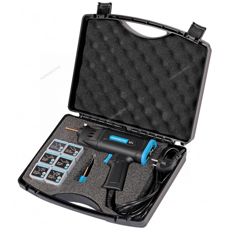 Термостеплер NORDBERG WP4 в наборе со скобами используется в автомастерских, в гараже или на станциях технического обслуживания автотранспорта.ФУНКЦИОНАЛПредназначен для ремонта пластиковых деталей путем армирования шва металлическими скобами, которые разогреваются и вводятся в пластик.ПРЕИМУЩЕСТВАМощность 75 Вт обеспечивает быстрый нагрев прибораБольшой набор скоб в комплекте для различных типов трещин3 скорости нагреваФункции защиты от перегрева и перегрузкиУДОБСТВО ИСПОЛЬЗОВАНИЯБлагодаря эргономичной форме прибор удобно держать в рукеLED-подсветка рабочей зоны позволяет использовать термостеплер при недостаточном освещенииКОМПЛЕКТАЦИЯТермостеплерСкоба волнообразная 0,6 мм - 50 шт.Скоба волнообразная 0,8 мм - 50 шт.Скоба широкая 0,8 мм - 50 шт.Скоба широкая 0,6 мм - 50 шт.Скоба с внешним углом 0,8 мм - 50 шт.Скоба с внутренним углом 0,6 мм - 50 шт.Насадка для разглаживания швовПластиковый кейсПаспорт-инструкцияТермостеплер для ремонта пластика в кейсе NORDBERG WP4 позволит качественно ремонтировать дорогостоящие пластиковые детали автомобилей, обеспечивая надежное и аккуратное соединение их частей.