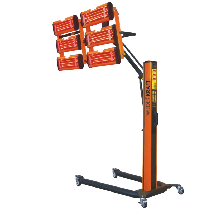 Мобильная шестикассетная инфракрасная установка для сушки лакокрасочных покрытий ИК излучением WiederKraft WDK-6CL. Два блока из трех кассет с коротковолновыми ИК лампами размещены на пантографической стойке. Кассетный блок легко поднимается на высоту 2300 мм, позволяя сушить даже крышу автомобиля. Стойка прибора оборудована газовым амортизатором для поддержки и изменения положения кассетного блока.
