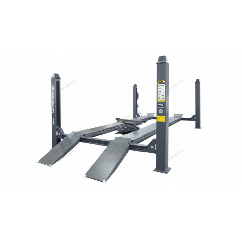 NORDBERG 4450_MG(M) — предназначен для диагностики, обслуживания, ремонта и регулировки углов установки колёс. Подходит для легковых автомобилей, внедорожников, минивэнов и лёгких коммерческих грузовиков.ПРЕИМУЩЕСТВАОпционально: двухсекционные заездные трапы — удобны для автомобилей с низким клиренсом;В комплекте присутствует траверса NORDBERG N433G. Также имеется возможность приобрести дополнительную траверсу для подъема машины с двух сторон;Совместимость со стендами сход-развала — для измерения и регулировки углов установки колёс (РУУК);Регулируемое расстояние между платформами (800, 900 или 1025 мм) — точная настройка под ширину колеи разных транспортных средств;Задние сдвижные платформы на фторопластовых опорах — увеличенный ресурс по сравнению с металлическими шариковыми опорами;Автоматическая блокировка стопорного механизма с ручным управлением — предотвращает падение при обрыве троса;Тросы синхронизации с гальваническим покрытием — повышенная устойчивость к коррозии и длительный ресурс при интенсивной эксплуатации;Противоскользящее покрытие трапов и платформ — улучшенное сцепление колёс при заезде авто на подъемник;Надёжная гидростанция европейского производителя Bucher;Анкерные болты в комплекте — 16×140 мм.NORDBERG 4450_MG(M) — профессиональный четырёхстоечный подъёмник, сочетающий высокую грузоподъёмность, точность и безопасность. Оптимальное решение для автосервисов, где требуется эффективная и качественная работа с подвеской и ходовой частью.