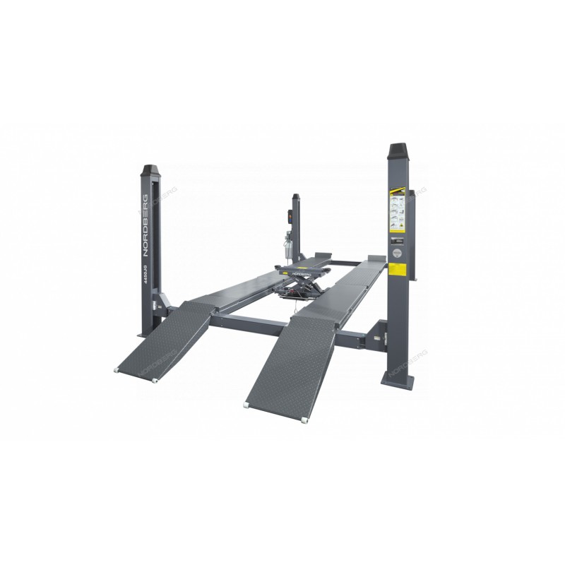 NORDBERG 4450J_EG(M) — предназначен для диагностики, обслуживания, ремонта и регулировки углов установки колёс. Подходит для легковых автомобилей, внедорожников, минивэнов и лёгких коммерческих грузовиков.ПРЕИМУЩЕСТВАОпционально: двухсекционные заездные трапы — удобны для автомобилей с низким клиренсом;В комплекте присутствует траверса NORDBERG N433G. Также имеется возможность приобрести дополнительную траверсу для подъема машины с двух сторон;Совместимость со стендами сход-развала — для измерения и регулировки углов установки колёс (РУУК);Регулируемое расстояние между платформами (800, 900 или 1025 мм) — точная настройка под ширину колеи разных транспортных средств;Широкие задние сдвижные платформы на фторопластовых опорах — увеличенный ресурс по сравнению с металлическими шариковыми опорами;Автоматическая блокировка стопорного механизма, управляемая электронным блоком, предотвращает падение платформы при обрыве троса;Тросы синхронизации с гальваническим покрытием — повышенная устойчивость к коррозии и длительный ресурс при интенсивной эксплуатации;Противоскользящее покрытие трапов и платформ — улучшенное сцепление колёс при заезде авто на подъемник;Надёжная гидростанция европейского производителя Bucher;Анкерные болты в комплекте — 16×140 мм.NORDBERG 4450J_EG(M) — профессиональный четырёхстоечный подъёмник, сочетающий высокую грузоподъёмность, точность и безопасность. Оптимальное решение для автосервисов, где требуется эффективная и качественная работа с подвеской и ходовой частью.