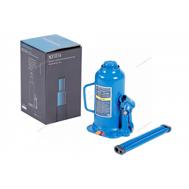 Домкрат бутылочный NORDBERG N31016 – профессиональное грузоподъемное оборудование для сервисных работ в автотранспортных предприятиях, автомастерских и СТО.ФУНКЦИОНАЛГидравлический домкрат с ручным приводом способен поднимать различные виды грузов и транспортных средств до 16 тонн, обеспечивая надежную и безопасную процедуру подъема.ПРЕИМУЩЕСТВАГрузоподъемность 16 тПлавный подъем груза при небольшом рабочем усилии оператора, обеспечивается оптимальной конструкцией гидравлической системы домкратаВыдвижной винт 8 смМогут быть использованы в качестве рабочего элемента в более сложных устройствах, таких как прессы, трубогибы и прочее, где рабочий элемент располагается вертикально или горизонтальноНадежная эксплуатацияУДОБСТВО ИСПОЛЬЗОВАНИЯПростое использованиеМинимальное техническое обслуживаниеКОМПЛЕКТАЦИЯДомкрат NORDBERG N31016РукоятьПаспорт-инструкцияБутылочный домкрат NORDBERG N31016 – высококачественное силовое оборудование для выполнения подъемных работ при диагностике и ремонте автомобиля в автосервисах, шиномонтажах и автотранспортных предприятиях.