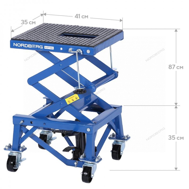 NORDBERG N3T150 — профессиональный подкатной мотоподъёмник. Применяется в мастерских, СТО и гаражах.ФУНКЦИОНАЛПлатформенный подъёмник, предназначенный для подъёма и фиксации мотоциклов и другого двухколёсного транспорта при проведении технического обслуживания и ремонтных работ.ПРЕИМУЩЕСТВАГрузоподъёмность 136 кг — подходит для большинства моделей мотоциклов;Высота подъёма: от 350 до 870 мм — широкий диапазон регулировки для удобного доступа;Механический привод — не требует подключения к электросети.УДОБСТВО ИСПОЛЬЗОВАНИЯПедаль подъёма платформы — подъём без усилий, руки остаются свободными;Педаль опускания — плавное и контролируемое снижение платформы;Поворотные колёса со стопором — для удобного перемещения и надёжной фиксации подъёмника;Резиновый коврик и крепление с крюком — защита мотоцикла от повреждений и устойчивость на платформе.NORDBERG N3T150 — удобное и надёжное решение для профессионального и гаражного обслуживания мототехники.