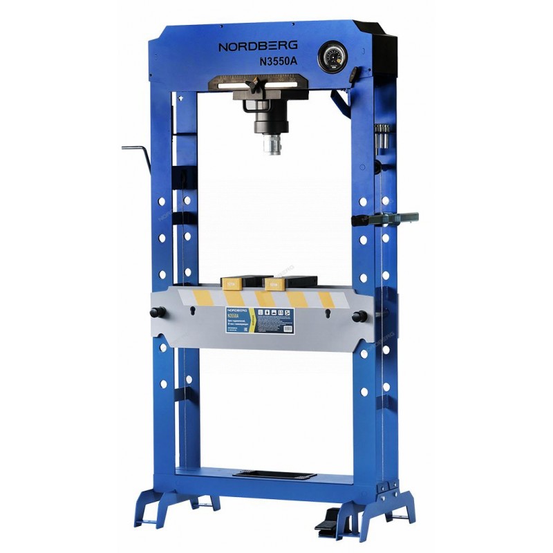 Гидравлический пресс PRO NORDBERG N3550A – оборудование для выполнения различных ремонтных работ в автосервисах и СТО.ФУНКЦИОНАЛИспользуется при следующих ремонтно-монтажных работах: выпрессовки подшипников и втулок, правки валов, осей, профилей, для прессования заготовок.ПРЕИМУЩЕСТВАМаксимальное усилие 50 тоннДвухскоростной насос: "умный клапан" позволяет подводить шток цилиндра пресса к обслуживаемой детали с увеличенной скоростью, а после доводки и соприкосновения с поверхностью детали шток замедляет свой ход, чтобы оператор мог лучше контролировать процесс выпрессовки/запрессовки, при этом не возрастает усилие, прилагаемое оператором к ручке насосаКонструкция рамы выполнена на высокоточных лазерных станках сварочные швы выполнены роботизированным сварочным комплектомОкраска порошковым антикоррозионным составом по типу "шагрень"Защита тросса в нижней части от падений обрабатываемых элементовФиксаторы предотвращающие соскальзывание рабочих насадок со станиныВстроенный лоток болтов и аксессуаровВинтовая регулировка наконечника штокаВозможность смещения гидравлического цилиндраРегулировка положения рабочего стола с помощью лебедкиПедаль управления пневмонасосомУДОБСТВО ИСПОЛЬЗОВАНИЯМанометр для контроля рабочего давления расположен на уровне глаз.КОМПЛЕКТАЦИЯГидравлический пресс NORDBERG N3550AПластины трапециинабор насадок (пуансонов); Размер пуансон (7 шт.): 15, 2, 3, 6, 13, 10, 8 тПаспорт-инструкцияПресс гидравлический напольный PRO NORDBERG N3550A – незаменимое оборудование в автосервисах, гаражах, позволяющее эффективно и быстро выполнять различные ремонтные работы.
