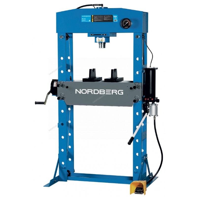 Гидравлический пресс с ручным пневмоприводом NORDBERG N3650A – оборудование для выполнения ремонтных работ в автосервисах и СТО.ФУНКЦИОНАЛИспользуется при следующих ремонтно-монтажных работах: выпрессовки подшипников и втулок, правки различных деталей, запрессовывания, для контроля допустимой нагрузки и надежности сварочных швов и пр.ПРЕИМУЩЕСТВАМаксимальное усилие 50 тРегулировка положения рабочего стола с помощью лебедки2 пластины-трапецииАвтоматический возврат поршняНадежная сварная рама обеспечивает устойчивость конструкцииГидравлический насос с пневмоприводомНожная педальПорошковое покрытие корпуса препятствует образованию коррозииЗащита от перегрузок благодаря предохранительному клапануУДОБСТВО ИСПОЛЬЗОВАНИЯРегулируемый рабочий стол и перемещение гидравлического цилиндра по оси позволяет работать с крупногабаритными деталями.Глицеринозаполненный манометр большого диаметра для контроля силы нагрузки расположен на уровне глаз.КОМПЛЕКТАЦИЯГидравлический пресс NORDBERG N3650AПаспорт-инструкцияПресс с ручным пневмоприводом NORDBERG N3650A – незаменимое оборудование в автосервисах, СТО, гаражах, позволяющее эффективно и быстро выполнять различные ремонтные работы.