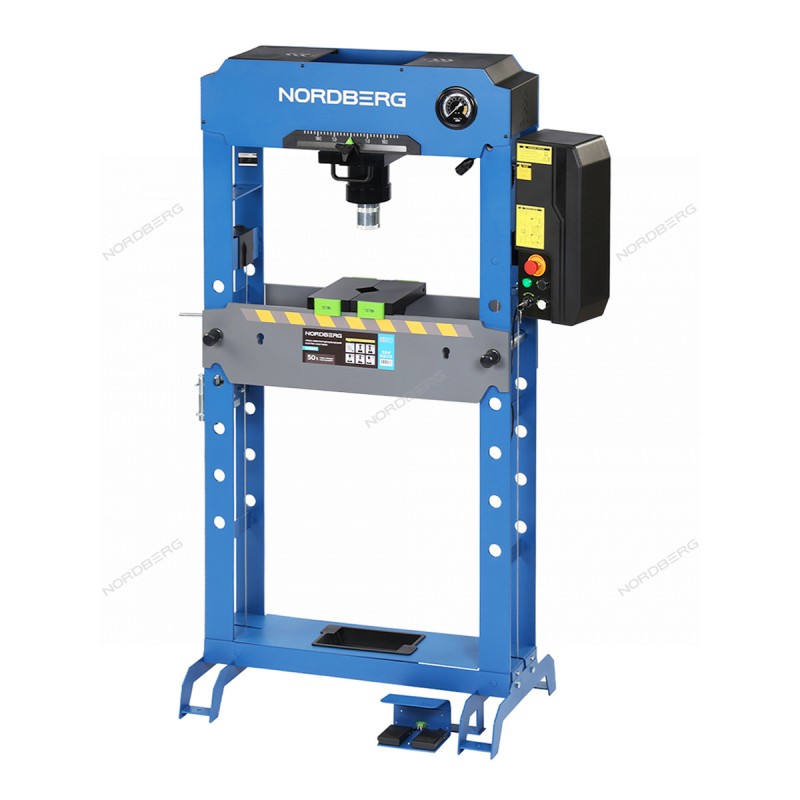 NORDBERG N3550E — электрогидравлический пресс, предназначенный для выпрессовки, запрессовки и правки деталей, узлов и механизмов. Обеспечивает стабильное и контролируемое усилие при выполнении ремонтных и монтажных работ.ПРЕИМУЩЕСТВАУсилие 50 тонн — позволяет использовать пресс в промышленности и при обслуживании тяжёлой техники;Рабочий цилиндр с горизонтальным смещением влево и вправо на 140 мм от центра — обеспечивает точное позиционирование штока относительно заготовки;Регулировка рабочего стола по высоте — удобная адаптация под размеры обрабатываемых деталей;Механическая лебёдка — облегчает подъём и опускание рабочего стола;Хромированный шток гидроцилиндра — защита от коррозии и увеличенный срок службы;Электрогидравлический привод с кнопочным и ножным управлением — повышает комфорт работы оператора;V-образные установочные блоки с поворотными фиксаторами — надёжная фиксация деталей без смещения;Манометр — контроль усилия в режиме реального времени;Предохранительный клапан — защита от перегрузки и возможность ручного сброса давления в цилиндре;Встроенный LED-фонарь — улучшенная видимость рабочей зоны;Лоток для запасных частей — все необходимые элементы всегда под рукой;Штифт рабочего стола с пластиковой втулкой — снижение износа и плавность установки;Набор пуансонов для установки на шток, различных диаметров;Усиленные опоры с отверстиями под болты — высокая устойчивость при работе под нагрузкой.NORDBERG N3550E — надёжный и мощный электрогидравлический пресс, сочетающий высокое усилие, удобство управления и продуманную конструкцию, оптимально подходящий для профессионального использования на СТО и в ремонтных цехах.