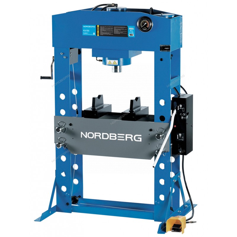 Гидравлический пресс с ручным пневмоприводом NORDBERG N36100A – оборудование для выполнения ремонтных работ в автосервисах и СТО.ФУНКЦИОНАЛИспользуется при следующих ремонтно-монтажных работах: выпрессовки подшипников и втулок, правки различных деталей, запрессовывания, для контроля допустимой нагрузки и надежности сварочных швов и пр.ПРЕИМУЩЕСТВАМаксимальное усилие 100 тРегулировка положения рабочего стола с помощью лебедки2 пластины-трапецииАвтоматический возврат поршняНадежная сварная рама обеспечивает устойчивость конструкцииГидравлический насос с пневмоприводомНожная педальПорошковое покрытие корпуса препятствует образованию коррозииЗащита от перегрузок благодаря предохранительному клапануУДОБСТВО ИСПОЛЬЗОВАНИЯРегулируемый рабочий стол и перемещение гидравлического цилиндра по оси позволяет работать с крупногабаритными деталями.Глицеринозаполненный манометр большого диаметра для контроля силы нагрузки расположен на уровне глаз.КОМПЛЕКТАЦИЯГидравлический пресс NORDBERG N36100AПаспорт-инструкцияПресс с ручным пневмоприводом NORDBERG N36100A – незаменимое оборудование в автосервисах, СТО, гаражах, позволяющее эффективно и быстро выполнять различные ремонтные работы.