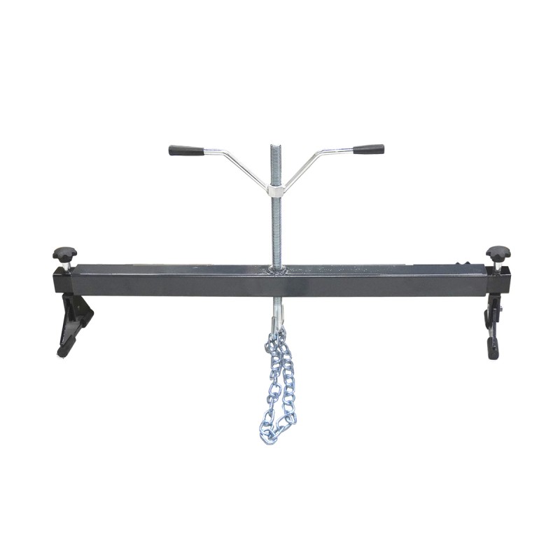 Траверса применяется в автомастерских для вывешивания двигателя. Она оснащена металлической цепью, обеспечивающей надежную фиксацию груза. Для точной горизонтальной установки предусмотрены регулировочные болты. Проста в использовании и не требует специального обслуживания.