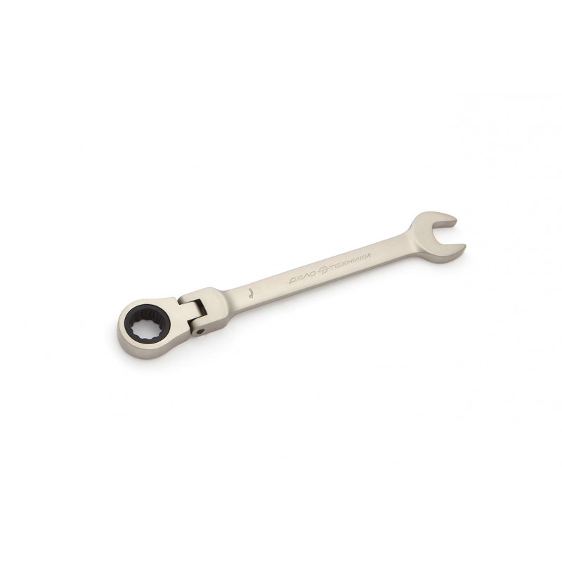 Комбинированный ключ из хромованадиевой стали с надёжным 72-зубцовым храповым механизмом в накидной части, выполненном в виде поворотного шарнира. Шарнирный ключ с трещоткой ускоряет отворачивание и заворачивание крепежа как в обычных условиях, так и в условиях ограниченного пространства. Минимальный угол возврата ключа составляет 5º.