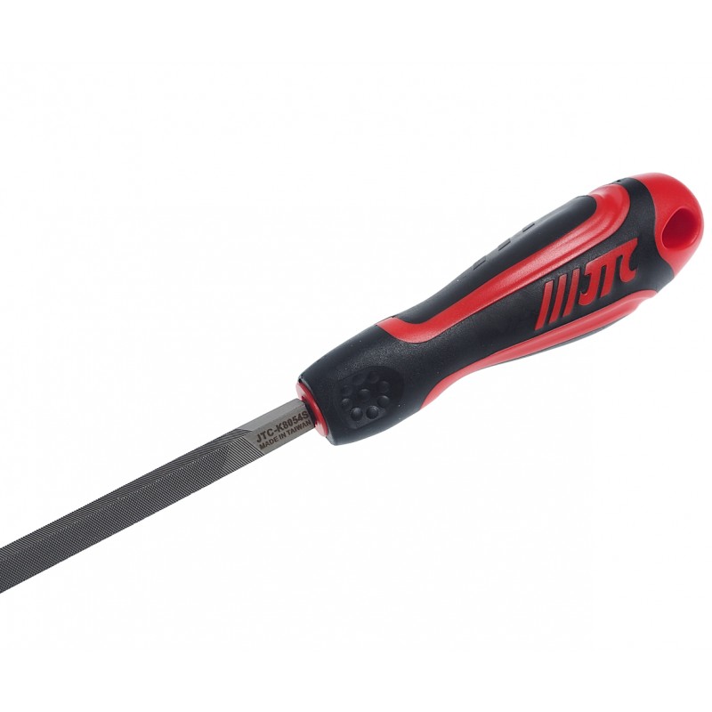 Квадратный напильник JTC-K8054S с гладкими зубьями имеет длину в 200 мм и прорезиненную анатомическую рукоятку с отверстием для подвешивания инструмента.