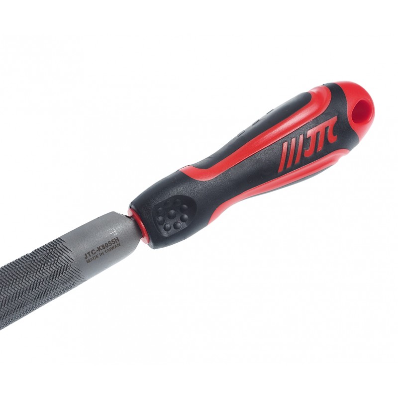 Полукруглый напильник JTC-K8055H с грубыми зубьями имеет длину в 200 мм и прорезиненную анатомическую рукоятку с отверстием для подвешивания инструмента.