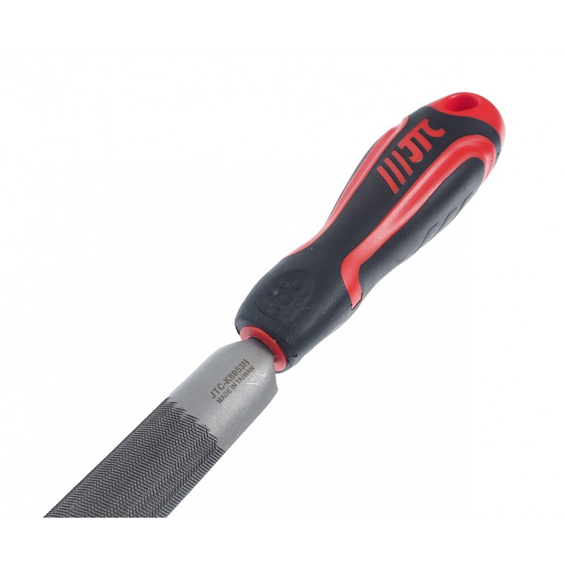 Полукруглый напильник JTC-K8053H со средними зубьями имеет длину в 200 мм и прорезиненную анатомическую рукоятку с отверстием для подвешивания инструмента.