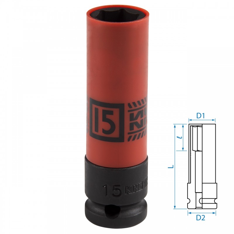 Головка торцевая ударная глубокая 1/2, 15 мм, тонкостенная, пластиковая защита KING TONY 494515M