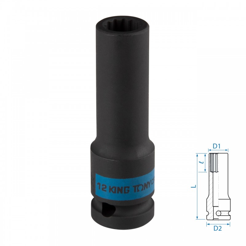 Технические характеристики Размер – 12 мм Посадочный квадрат – 1/2 Рабочий профиль – 12-гранный Рабочий диаметр (D1) – 20,8 мм Диаметр в основании (D2) – 24,8 мм Рабочая глубина (l) – 14,0 мм Общая длина (L) – 80,0 мм Материалы – инструментальная