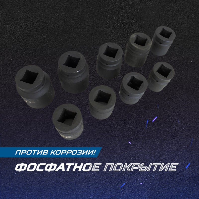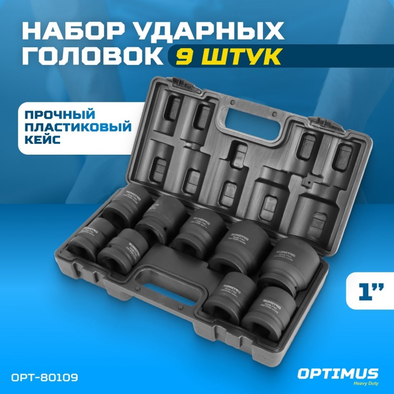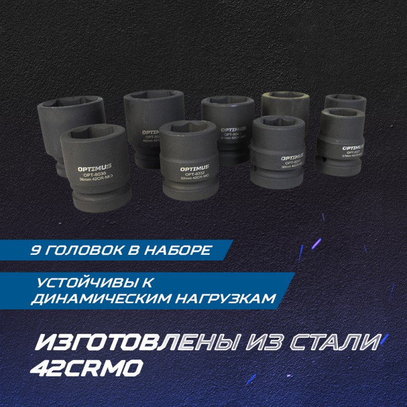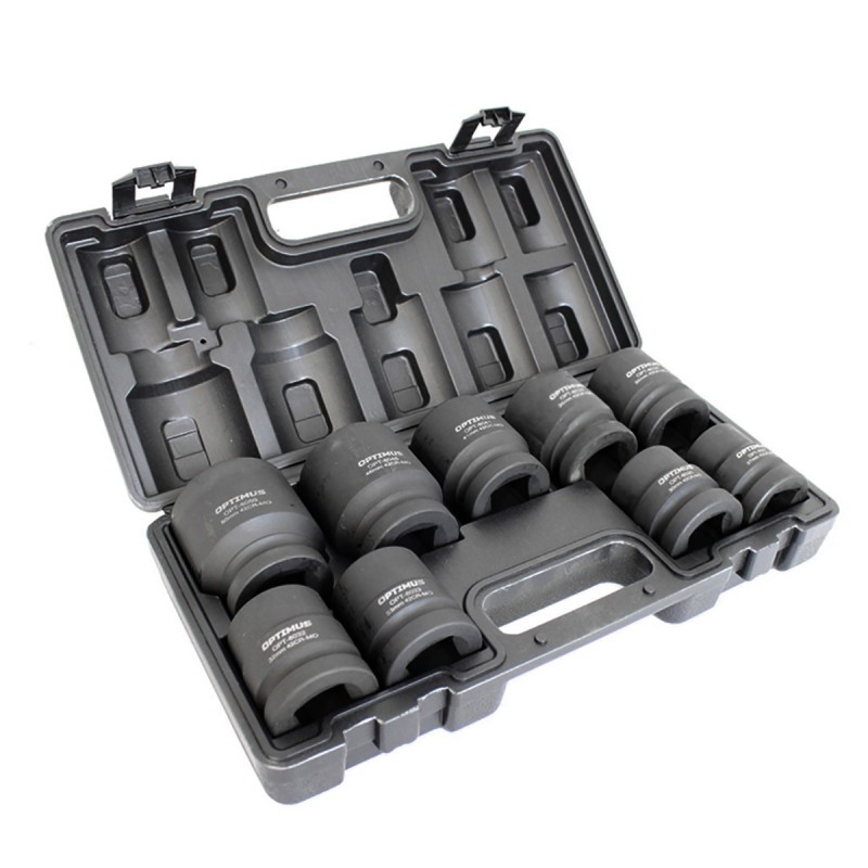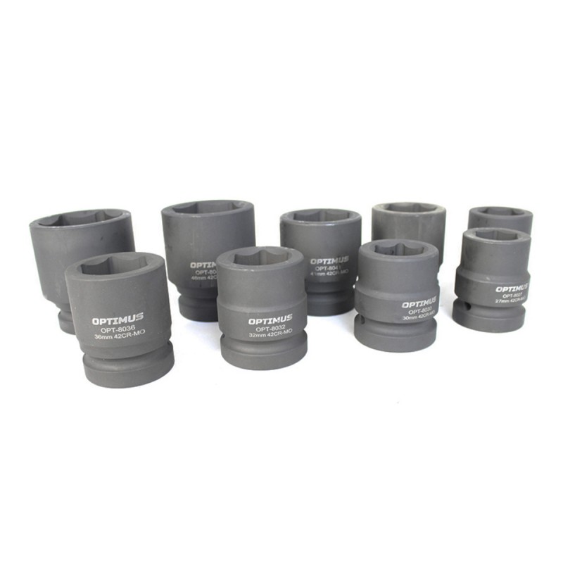 Набор ударных головок 9 шт, 27-50 мм, 1DR Optimus OPT-80109 применяется для демонтажа-монтажа туго завинченного крепежа с помощью гайковертов ударного действия, пневматических или электрических.