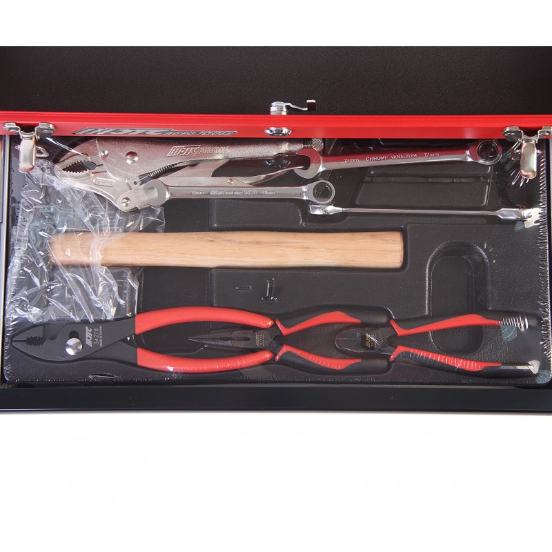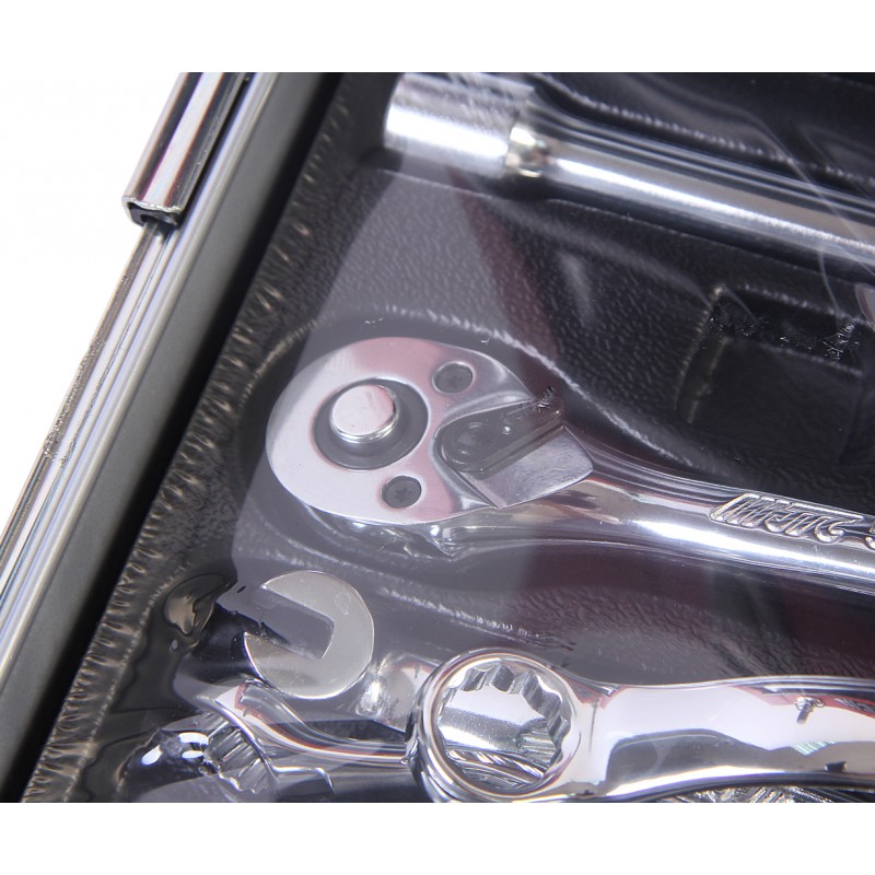 В набор входят молоток, струбцина, отвертки разных размеров (38-150 мм), трещотка (посадочный квадрат 3/8), биты, головки 8-22, магнитный свечной ключ 14, 16, 21.
