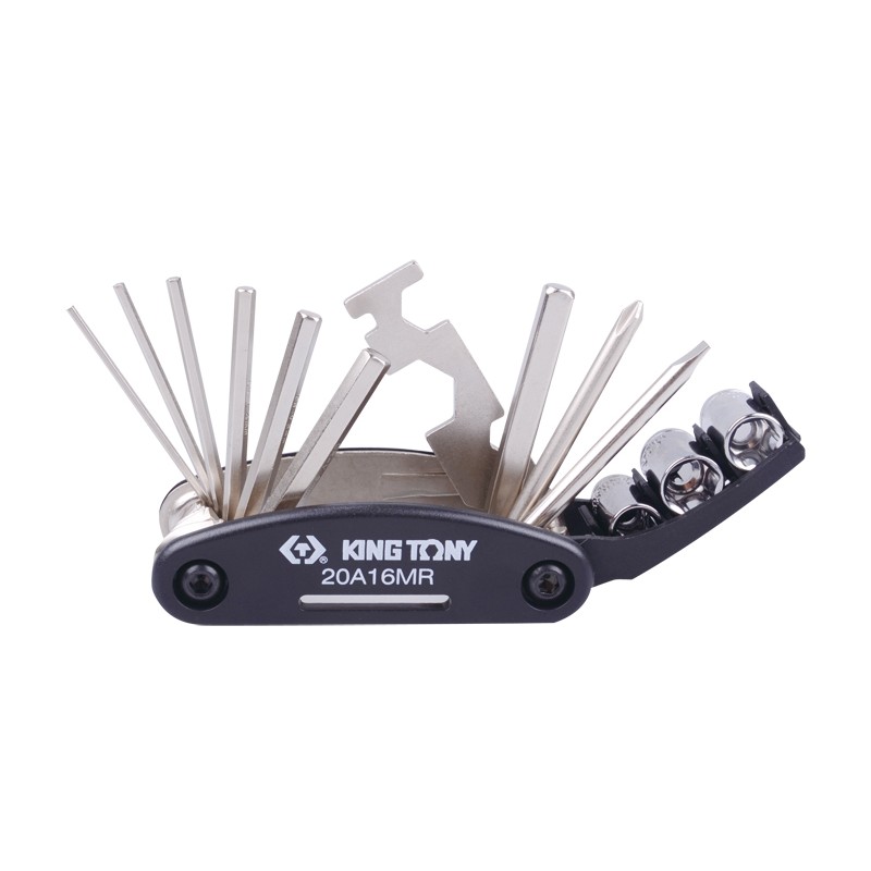 Набор инструментов для ремонта велосипедов, 16 предметов KING TONY 20A16MR.Универсальный, компактный и практичный набор. 16 инструментов в одном корпусе! Все инструменты, входящие в набор, удобно размещены в одной рукоятке, по принципу раскладного ножа. Для него не нужно много места. Достаточно одного кармана! Вам не придётся беспокоиться о сохранности предметов набора – достаточно сложить инструменты в ручку-держатель… И в путь! Имея набор такой всегда с собой, вас не застанет врасплох мелкая поломка или какая-либо неисправность вашего байка. Подтянуть гайку или винт, отрегулировать ослабленную спицу… Набор KING TONY 20A16MR с вами? Тогда всё отлично!