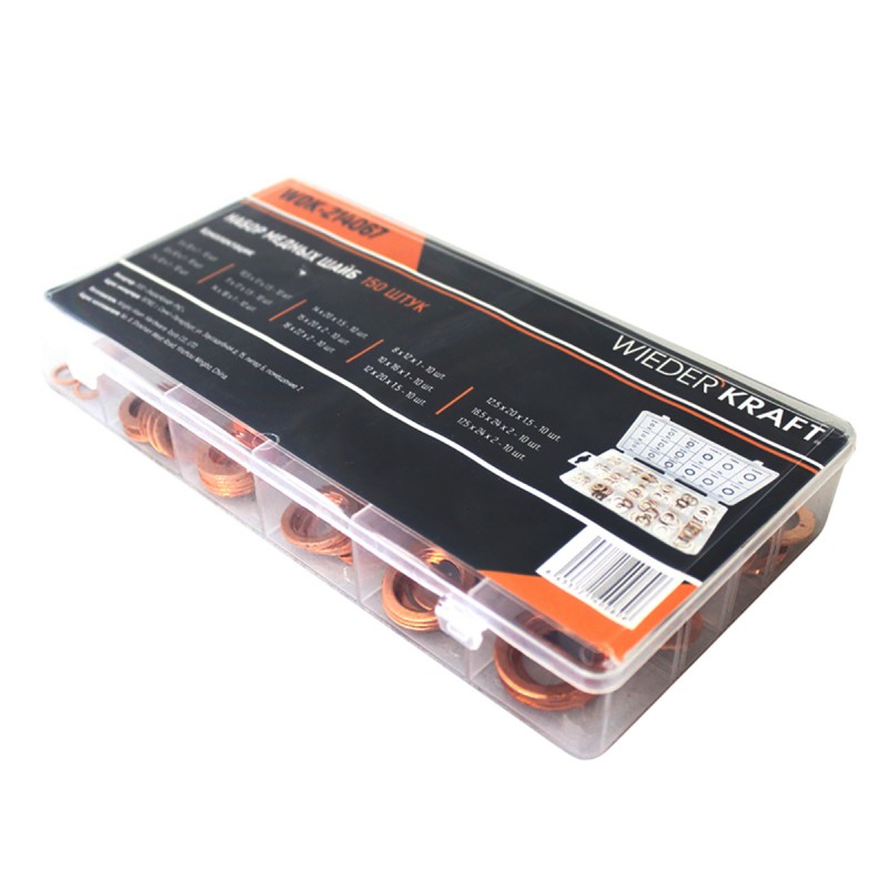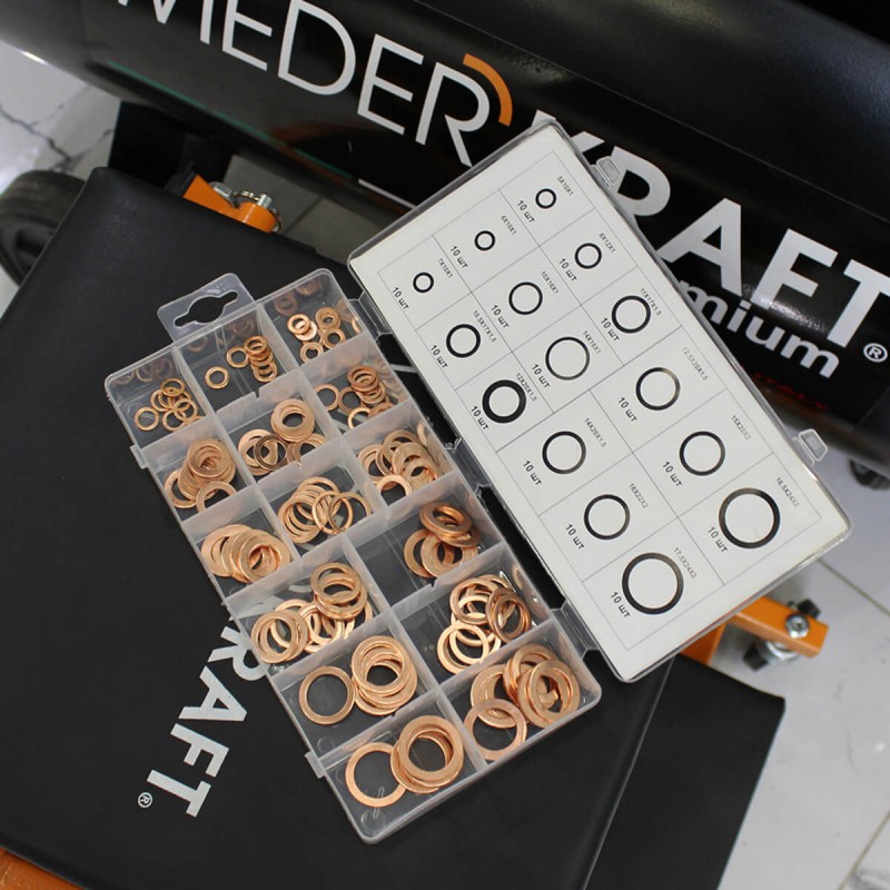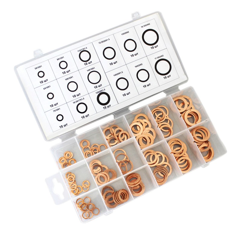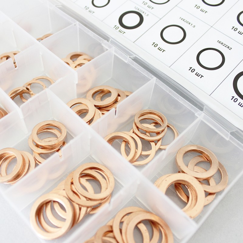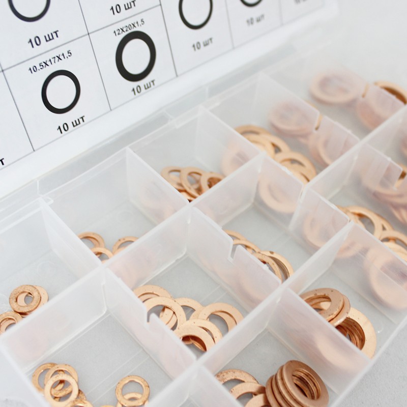 Набор медных шайб для быстрого и качественного уплотнения соединений в различных системах автомобиля (ходовая часть, форсунки и т.д.). В комплекте предусмотрены 15 типоразмеров шайб, что обеспечивает применяемость их к большинству марок и моделей автомобилей. Специальная таблица на крышке бокса позволяет быстро подобрать нужную по размеру шайбу. Для установки данных изделий не требуется каких-либо специальных знаний или умений.