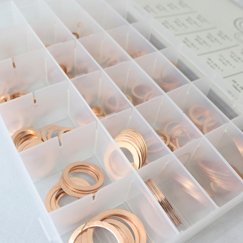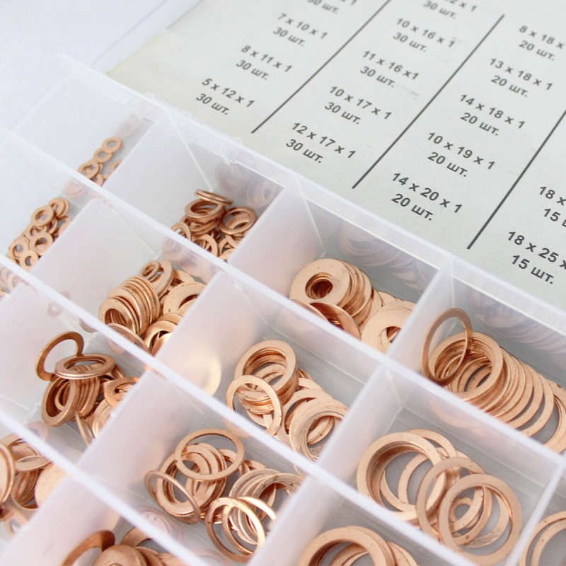 Набор медных шайб для быстрого и качественного уплотнения соединений в различных системах автомобиля (ходовая часть, форсунки и т.д.). В комплекте предусмотрены 30 типоразмеров шайб, что обеспечивает применяемость их к большинству марок и моделей автомобилей. Специальная таблица на крышке бокса позволяет быстро подобрать нужную по размеру шайбу. Для установки данных изделий не требуется каких-либо специальных знаний или умений.