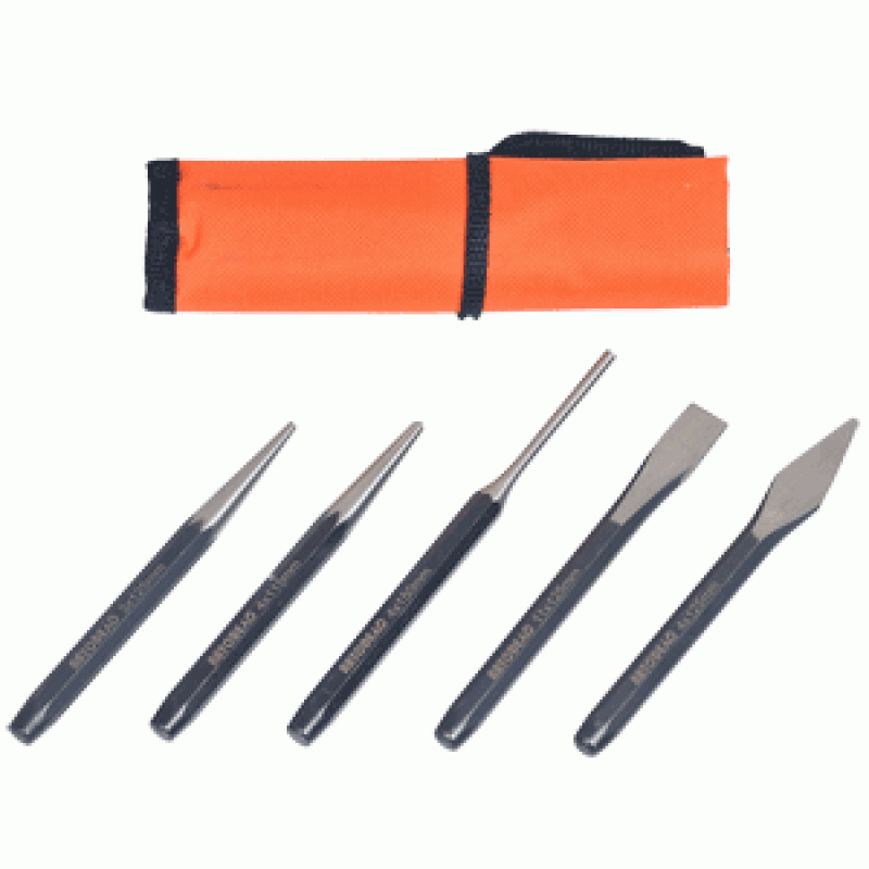 Набор ударного инструмента Изготовлены методом горячей штамповки (ковки на молотах). Набор состоит из пяти предметов - выколотки 4*150 мм, зубила 11*125 мм, бородка 5*125 мм, кернера 4*115 мм и крейцмейселя 4*125 мм. Укомплектован тканевой сумкой для удобства хранения. Материал - инструментальная сталь 60CRV. Инструмент закалён до твёрдости 54-58 HRC.