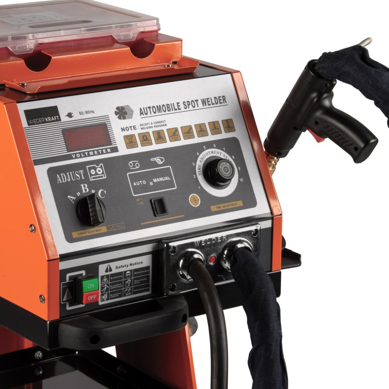 Профессиональный аппарат для выполнения кузовных работ по выравниванию/рихтовке металлических поверхностей, в т. ч. элементов кузова автомобиля. Панель управления оснащена переключателем силы сварочного тока позиционного типа (А-В-С) и регулятором времени импульса сварки для быстрой настройки параметров.