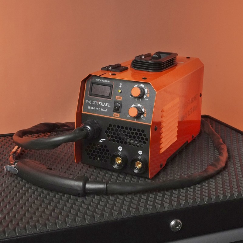 Сварочный полуавтомат MIG No Gas/MMA WiederKraft Weld 150 Mini оснащен силовым блоком на базе инверторной технологии IGBT, отличается небольшим весом и габаритами, а также отличными сварочными характеристиками. Конструкция аппарата включает встроенную катушку для проволоки весом до 1 кг. Преимущество работы заключается в регулируемой скорости подачи проволоки, тока и напряжения, наличию цифрового дисплея.