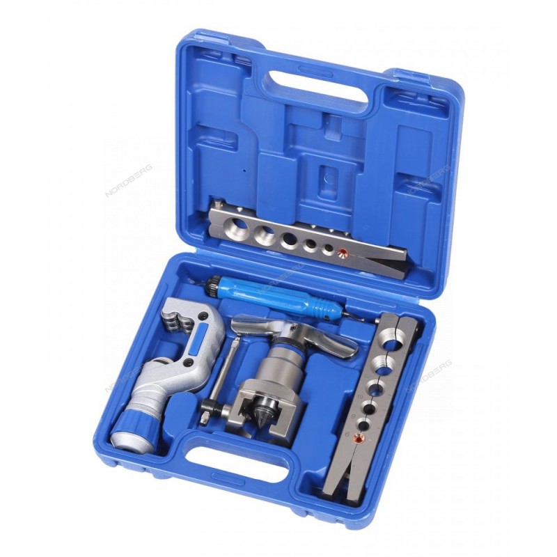 NORDBERG NFT6 — набор для развальцовки трубок, в кейсе. Профессиональный набор для холодной развальцовки концов металлических трубок.ФУНКЦИОНАЛНабор предназначен для холодной развальцовки медных и алюминиевых трубок с целью формирования герметичного соединения при монтаже холодильного, гидравлического и пневматического оборудования.ПРЕИМУЩЕСТВАХолодная развальцовка без нагрева — подходит для медных и алюминиевых трубок;В комплекте труборез для диаметров 4–32 мм;Конус на эксцентрике обеспечивает равномерное распределение усилия на стенки трубок;Дюймовая и метрическая матрицы предназначены для работы с трубками соответствующих стандартов и разных диаметров;Защита от перевальцовки предотвращает поломку инструмента и увеличивает срок его службы.УДОБСТВО ИСПОЛЬЗОВАНИЯПластиковый кейс обеспечивает компактное хранение и защиту инструментов при транспортировке.КОМПЛЕКТАЦИЯВальцовочная головка - 1 шт;Матрицы - 2 шт;Шабер - 1 шт;Труборез - 1 шт;Пластиковый кейс - 1 шт.NORDBERG NFT6 — надежное и удобное решение для профессиональной развальцовки трубок.