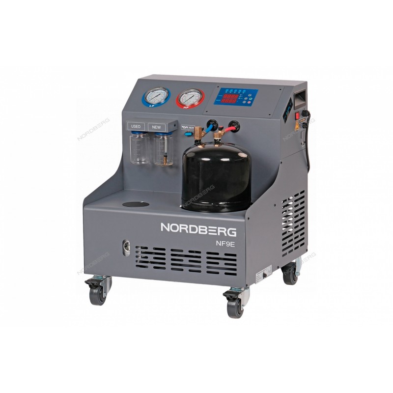NORDBERG NF9E — полуавтоматическая установка для заправки автомобильных кондиционеров.ФУНКЦИОНАЛУстановка предназначена для обслуживания, заправки и диагностики систем кондиционирования автомобилей.ПРЕИМУЩЕСТВАПроизводительность вакуумного насоса — 60 л/мин, стабильная работа без падения производительности;Скорость восстановления хладагента — 0,25 кг/мин, минимизирующая потери хладагента;Максимальная скорость заправки — до 2 кг/мин, обеспечивающая быструю заправку системы;Газовый баллон на 10 кг, позволяющий работать без частых дозаправок;Высокая точность весов: погрешность ±10 г, что обеспечивает точную дозировку хладагента;Мощность компрессора — 276 Вт, гарантирующая стабильную работу;Максимальное рабочее давление — 20 бар, подходящее для различных систем кондиционирования;Широкий диапазон рабочих температур — от 10 до 45 °C, позволяющий использовать установку в различных климатических условиях;Регулируемая система подачи хладагента: возможность настройки подачи с учётом особенностей системы;Объём бутыли для нового масла — 250 мл.УДОБСТВО ИСПОЛЬЗОВАНИЯПростое управление: интуитивно понятная панель управления;Функция восстановления хладагента: извлекает хладагент из системы кондиционирования автомобиля, очищает его и сохраняет в накопительном баллоне установки;Функция вакуумирования: эффективно удаляет воздух и влагу, создавая разрежение в системе до уровня, необходимого для впрыска газа и масла;Функция впрыска масла: вводит точное количество специального масла в систему кондиционирования для обеспечения её стабильной работы;Функция заправки: нагнетает нужное количество хладагента из накопительного баллона в систему автомобиля, гарантируя точность дозировки;Компактные размеры и удобная транспортировка: установка весит 57 кг и оснащена колёсами для удобного перемещения;Самодиагностика: предупреждает о возможных неисправностях и упрощает обслуживание;Автоматическая очистка: продлевает срок службы установки;Транспортировочные ручки: удобные скрытые ручки для перемещения установки по рабочей зоне;Удобные скрытые транспортировочные ручки для перемещения оборудования в рабочей зоне;Большие гидрозаполненные манометры: точные показания и удобство контроля давления;Маневренность: установка оснащена колёсиками для лёгкого перемещения.КОМПЛЕКТАЦИЯШланг ВД (красный, 3 м) – 1 шт;Шланг НД (синий, 3 м) – 1 шт;Муфты быстрого соединения (ВД и НД) – по 1 шт;Предохранитель 30 А – 2 шт;Заглушки для линии ВД и НД – 2 шт;Кабель передачи данных USB – 1 шт;Кабель питания – 1 шт;Инструкция по эксплуатации – 1 шт.NORDBERG NF9E — удобное, надёжное и эффективное решение для автосервисов, обеспечивающее профессиональное обслуживание автомобильных кондиционеров.
