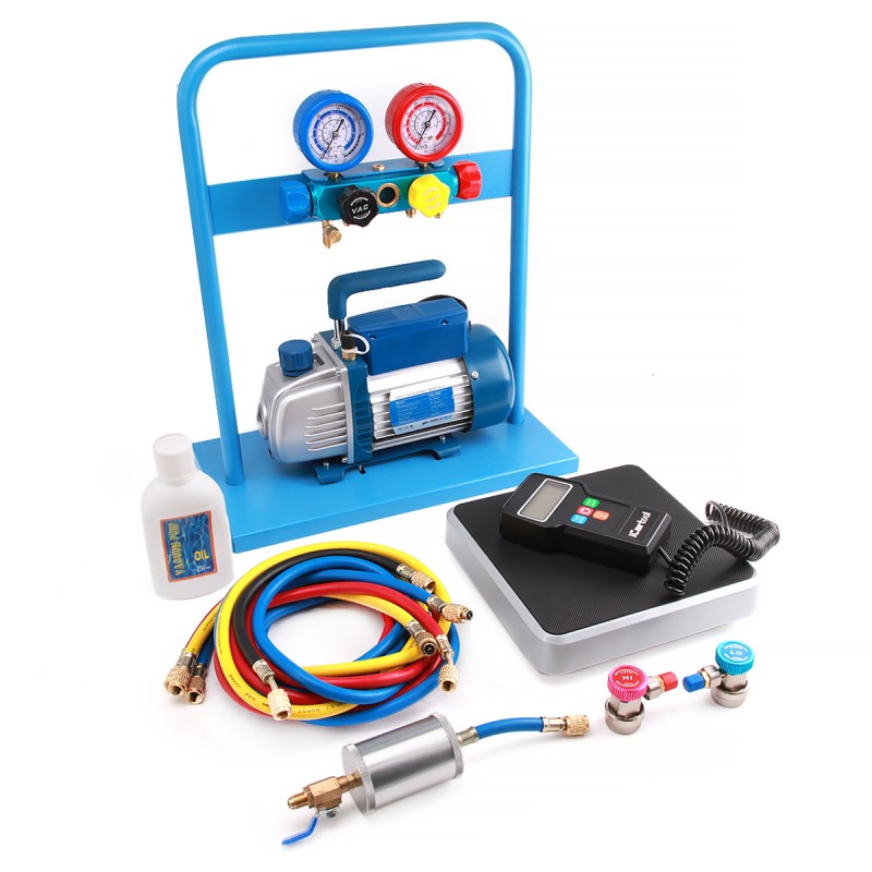 Дополнительно в комплект входят: электронные весы, заправочный цилиндр для масла и набор Г-образных быстросъемных разъемных соединений.