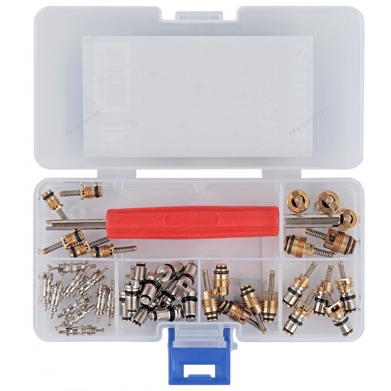 Набор ниппелей (золотников) для сервисных портов NORDBERG NFA6K и универсальный сервисный ключ используются для обслуживания систем кондиционирования автомобилей.ПРЕИМУЩЕСТВАвыполнены из качественных материаловширокий спектр размеровуниверсальный сервисный ключ в комплектеудобный пластиковый кейс с ячейкамиКОМПЛЕКТАЦИЯниппель 18,5х5,1 мм - 10 шт.ниппель 19,9х6 мм - 10 шт.ниппель 18,5х8 мм - 5 шт.ниппель 21,5х8 мм - 5 шт.ниппель 22х10 мм - 5 шт.ниппель 18,6х6 мм - 5 шт.универсальный сервисный ключ - 1 шт.пластиковый кейсНиппели с сервисным ключом NORDBERG NFA8K – универсальный набор инструментов для проведения ремонта систем кондиционирования автомобильного транспорта в автосервисах и СТО.