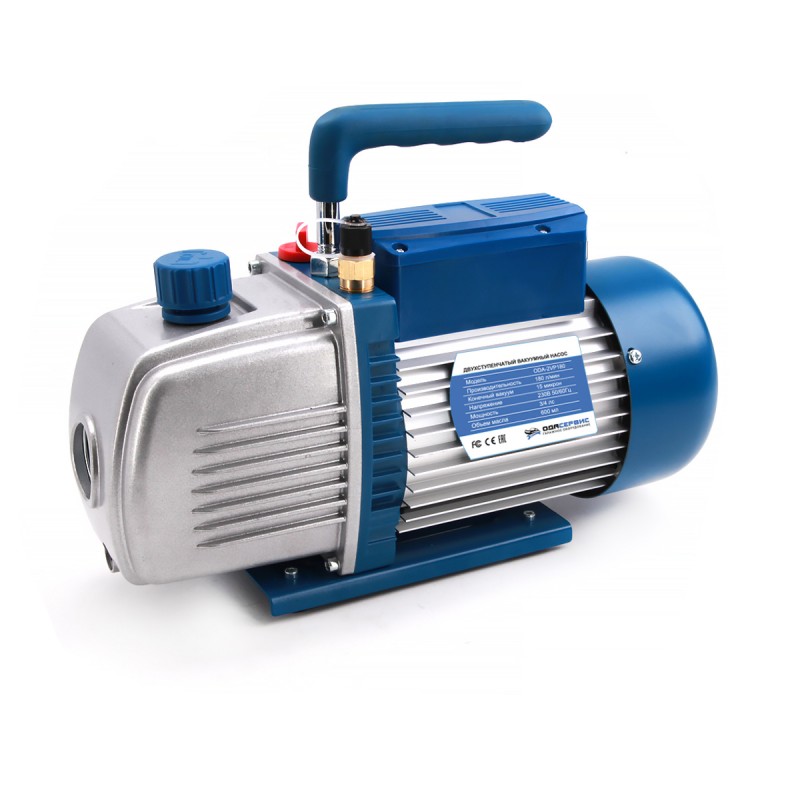 ODA-2VP180 - двухступенчатый вакуумный насос, пластинчато-роторного типа, с производительностью 180 л/мин. Основным отличием от одноступенчатых насосов, является двойное сжатие воздуха в момент вакуумирования, что сокращает время на вакуумирование и позволяет получить более глубокий вакуум. Насос применяется для создания вакуума путем откачки воздуха (газа) из герметичных емкостей, прежде всего, подходит для ремонта систем кондиционирования и холодильного оборудования (где используются хладагенты: R134a, R404, R22 и т.п), в медицинской технике, полиграфическом оборудовании, при производстве вакуумной упаковки, выполнении газоанализа, при горячем формовании пластмасс и т.п.