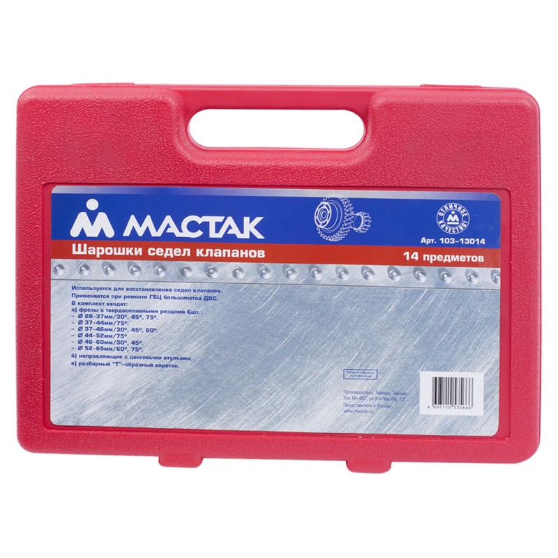 Набор фрез для правки сёдел клапанов, 28-65 мм, кейс, 14 предметов МАСТАК 103-13014C. Набор фрез предназначен для правки методом зенковки сёдел клапанов в двигателе внутреннего сгорания. Устройство МАСТАК 103-13014C позволит добиться идеального