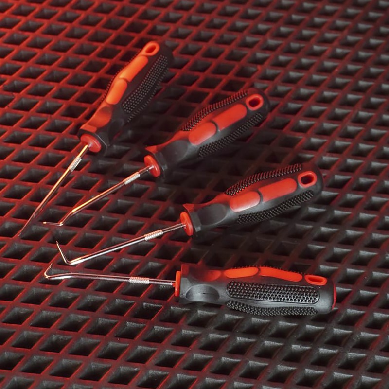 Набор мини крючков широко используется в сфере авторемонта, а также в слесарных мастерских. С их помощью осуществляют монтаж и снятие уплотнительных колец, разметку на поверхностях из различного материала и многое другое. Обрезиненная рукоять обеспечивает удобство эксплуатации, обладает противоскользящими свойствами. В комплекте 4 крючка разной формы: полный крючек, угловой крючок, крючок 90°, шило.