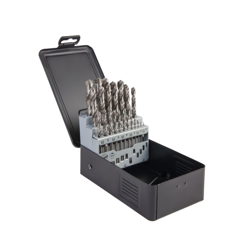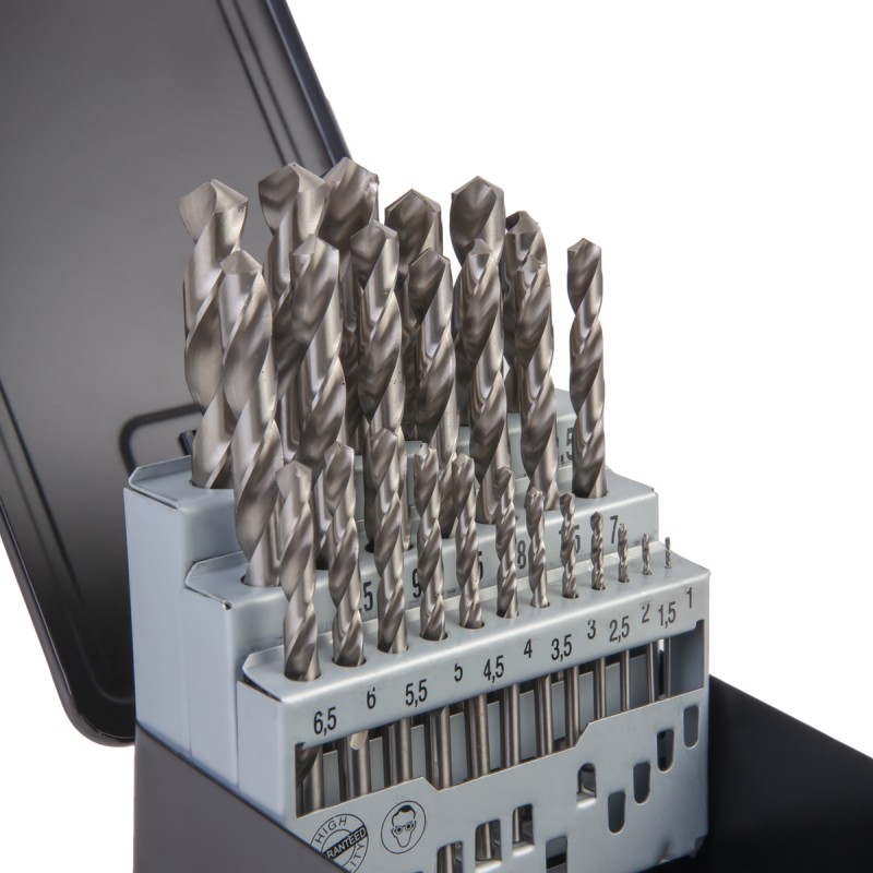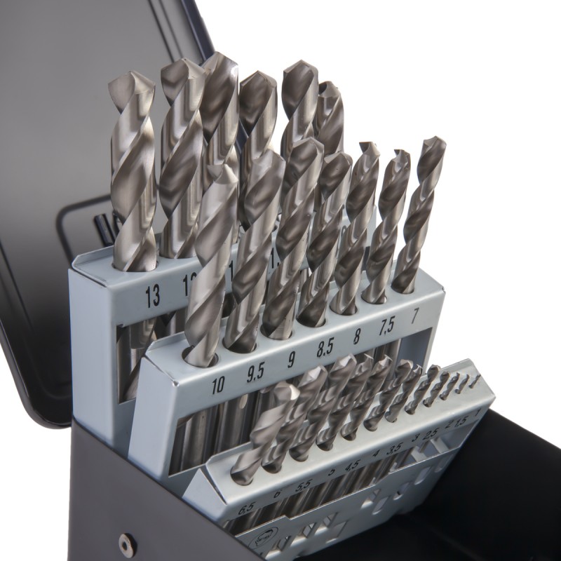 Сверла изготовлены из быстрорежущей стали HSS, шлифованный профиль — G, 25 предметов, металлический кейс. Применяются для сверления конструкционных материалов с твердостью до 25 HRC.