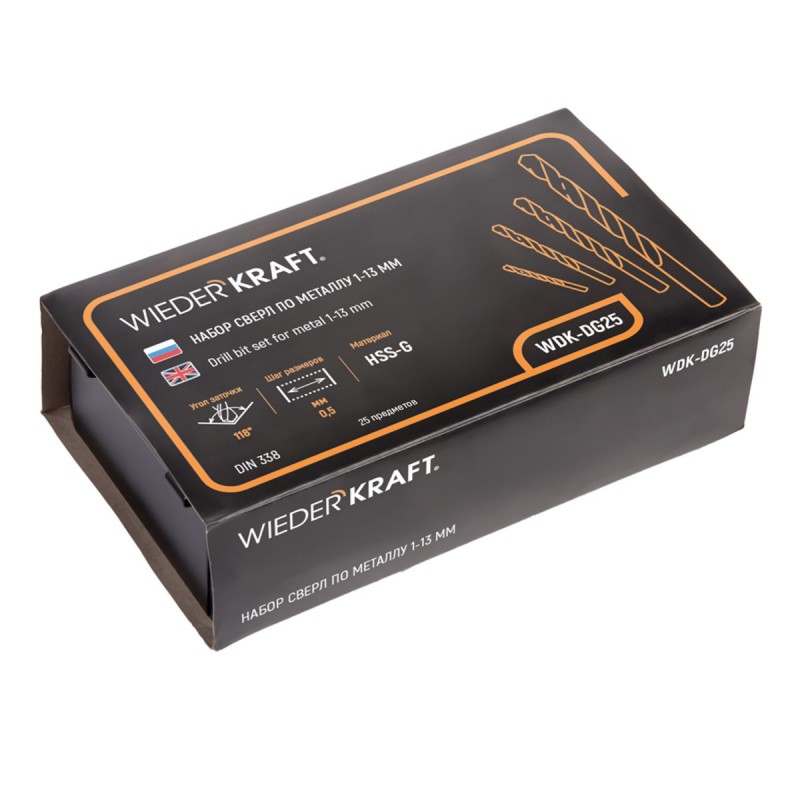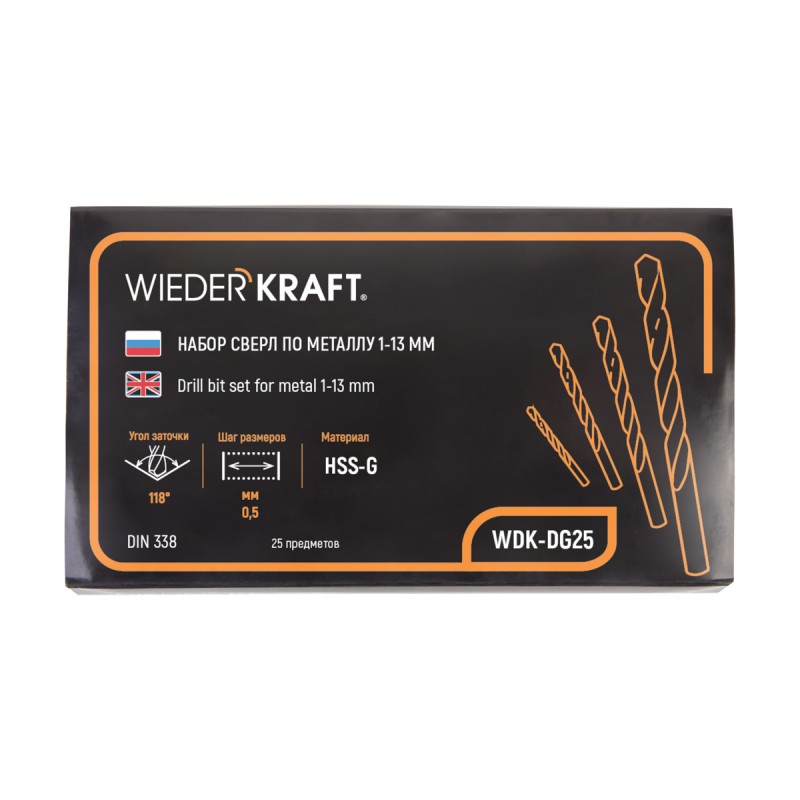 Набор сверл по металлу HSS-G 1-13 мм, шаг 0,5 мм, 25 предметов WDK-DG25